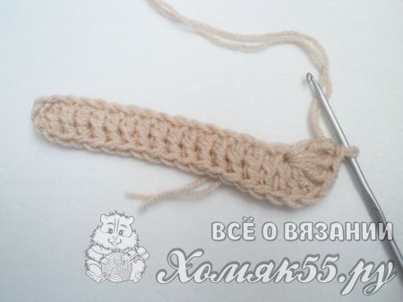 Делаем начальную петлю и вывязываем 16 воздушных петель. В 4 петлю от крючка выполняем 1 столбик с накидом. Далее во все петли, кроме последней, провязываем по 1 столбику с накидом. А в последнюю вяжем 6 столбиков с накидом.