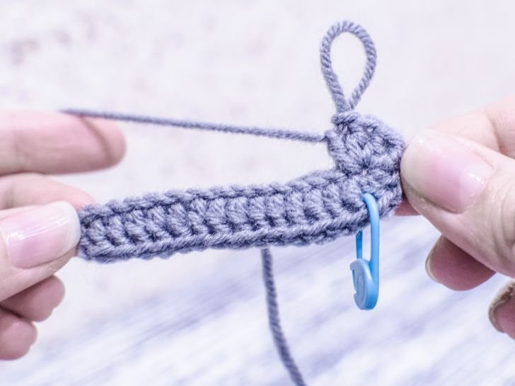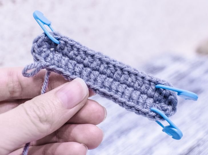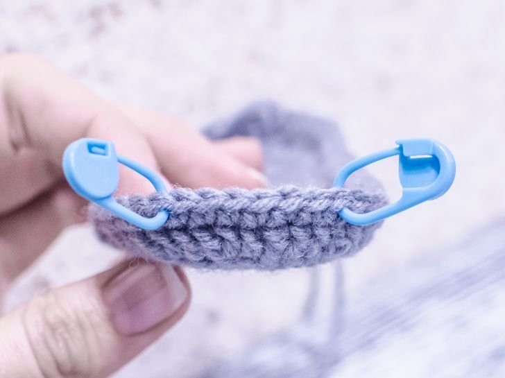6 ряд. Цвет нити - синий. Отмечаем 2 центральные петли задника и по седьмой петле слева и справа (центральные петли в счёт не включаем). Симметричность можно проверить, сложив пинетку пополам. Итак, соединительную петлю предыдущего ряда провязываем синим цветом и вяжем дальше ССН до голубого маркера. В петлю с маркером провязываем ПССН. Далее вяжем СБН без убавок до следующего голубого маркера, в петлю с маркером провязываем ПССН и далее довязываем ряд ССН, заканчиваем СС. Нить обрезаем.