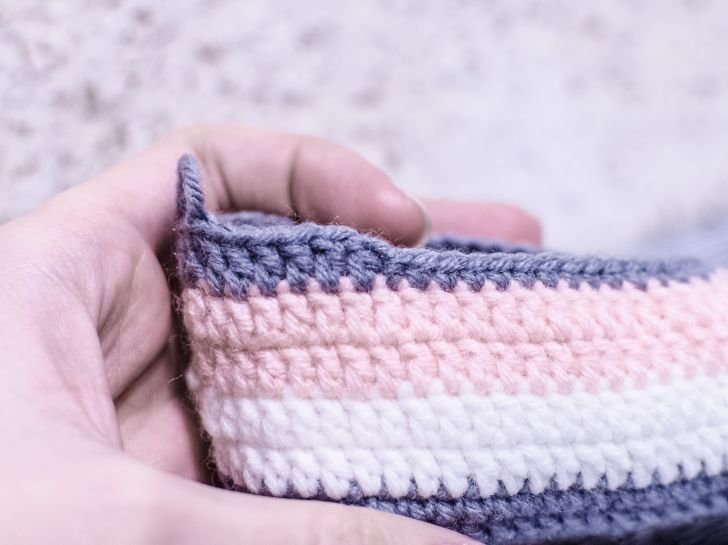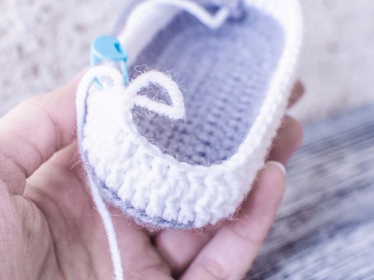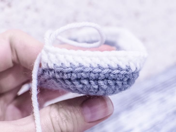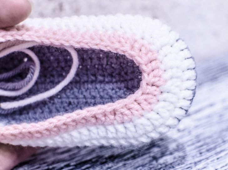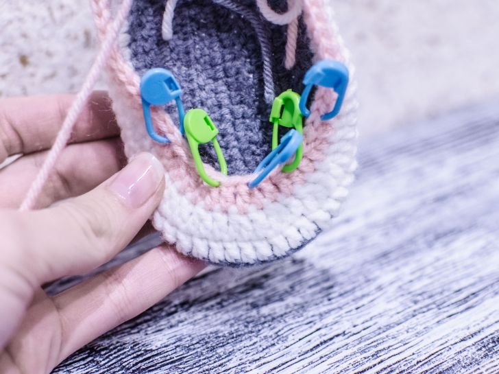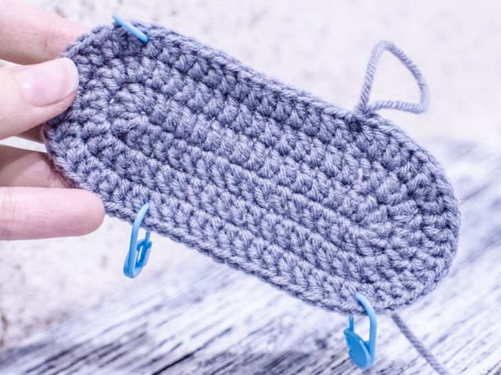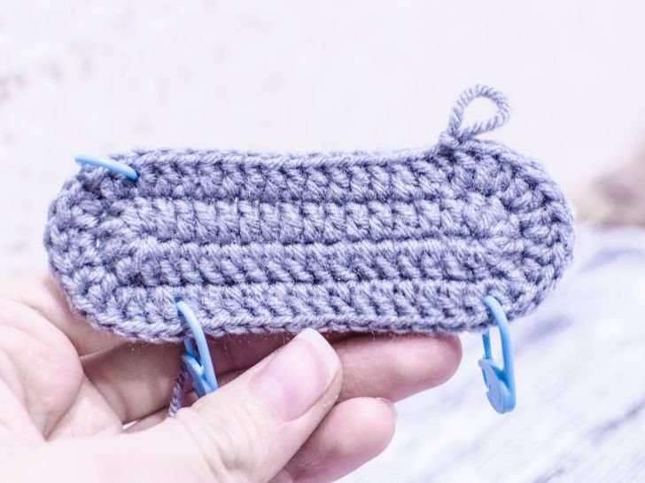 Начинаем вязать сам кроссовок с центра задней части подошвы. 1 ряд. Цвет нити – синий. 2 ВП подъема и провязываем ряд СБН без убавок/прибавок, закончить ряд СС. Подошва немного начнет загибаться. 2 ряд. Цвет нити – белый. Прежде чем вязать второй ряд, нужно маркерами отметить на передней части подошвы центральные 8 петель.