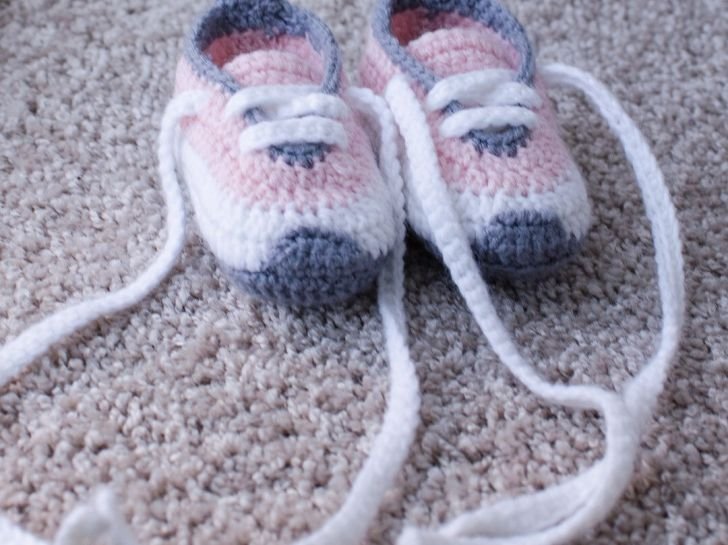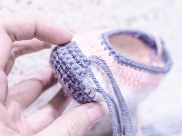 Шнурки. Цвет нити – белый. Длина – по желанию. Набираем около 120ВП, обратно вяжем СБН. Пришиваем носочек, задник, прячем ниточки, зашнуровываем. Кроссовки готовы.