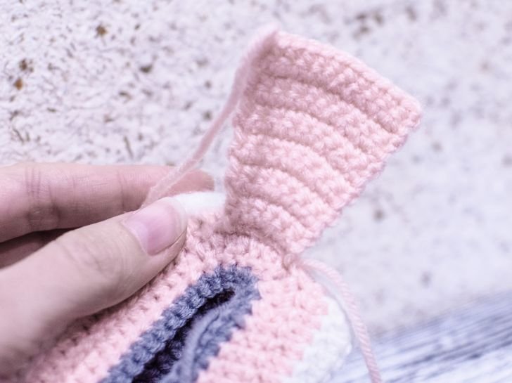 Язычок. Цвет нити – розовый. Выворачиваем изделие на изнаночную сторону и находим 5 петель для язычка. Вяжем поворотными рядами. 1 ряд. В первую петлю провязываем 2ВП. В остальные петли провязываем СБН, держа изделие как на рисунке. 2 ряд. 1ВП подъема. Ряд СБН, в центральную петлю провязать 2СБН. Итого 6СБН. 3 ряд. 1ВП подъема. Ряд СБН. 4 ряд. 1ВП подъема. Ряд СБН, в 3юю петлю провязать 2 СБН. Итого 7СБН. 5 ряд. 1ВП подъема. Ряд СБН. 6 ряд. 1ВП подъема. Ряд СБН, в центральную петлю провязать 2СБН. Итого 8СБН. 7 ряд. 1ВП подъема. Ряд СБН. 8 ряд. 1ВП подъема. Ряд СБН, в 5юю петлю провязать 2 СБН. Итого 9СБН. 9 ряд. 1ВП подъема. Ряд СБН. 10 ряд. 1ВП подъема. Ряд СБН, в центральную петлю провязать 2СБН. Итого 10 СБН. 11 ряд. 1ВП подъема. Ряд СБН. 12 ряд. 1ВП подъема. Ряд СБН, в 5юю петлю провязать 2 СБН. Итого 11 СБН. 13 ряд. 1ВП подъема. Ряд СБН.