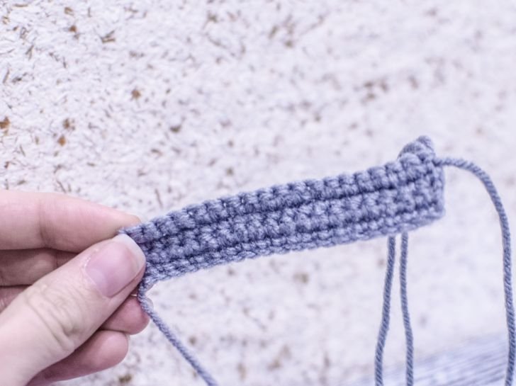 Задник. Цвет нити – синий. 1 ряд. Набираем 20 ВП, оставив нить для пришивания. 2 ряд. Во вторую петлю от крючка вяжем 19СБН. 3 ряд. ВП подъема, 19СБН. 4 ряд. ВП подъема, 19СБН. 5 ряд. ВП подъема, 19СБН. Оставляем нить для пришивания.