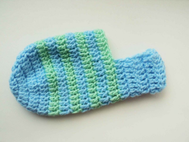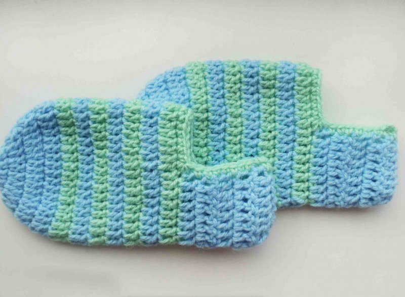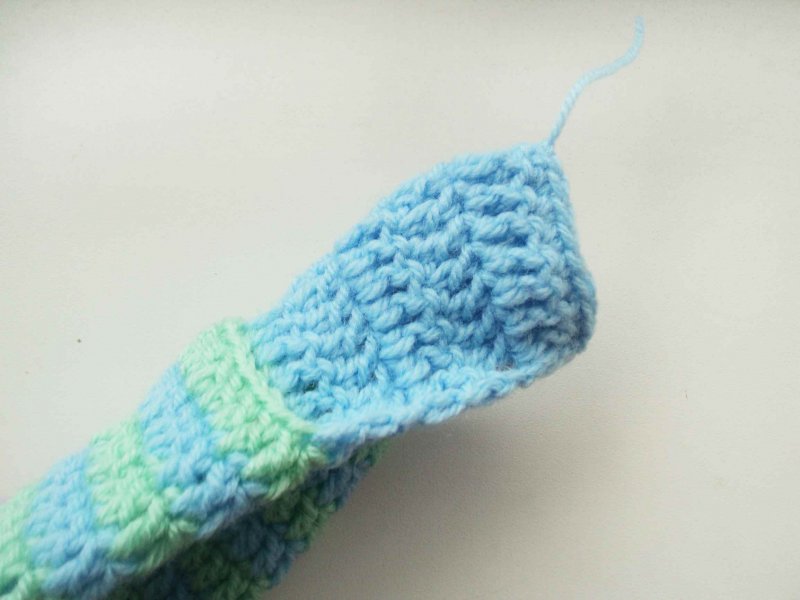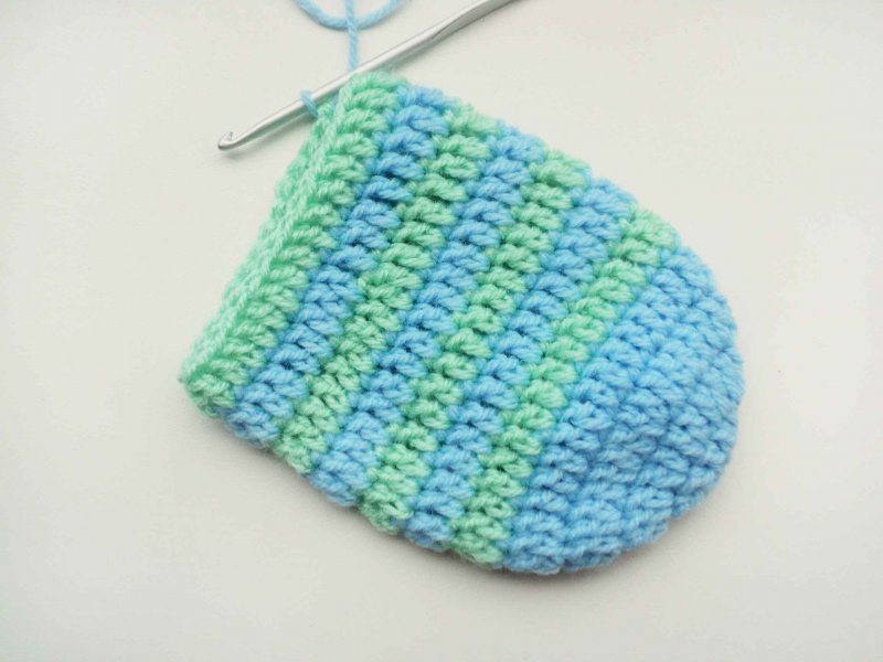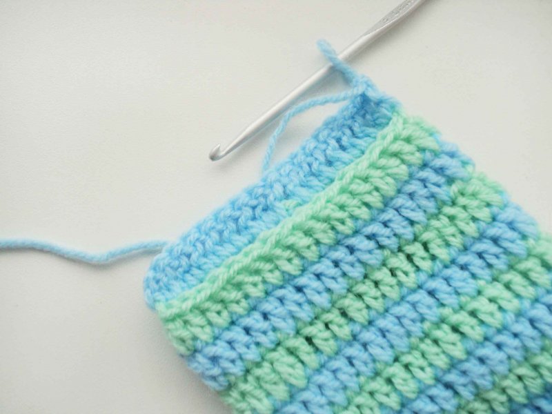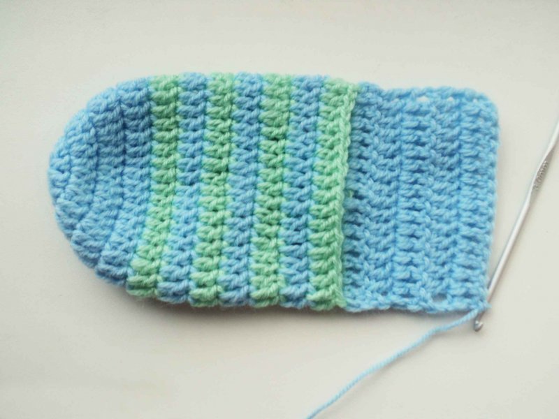 Затем нужно связать 1 ряд, не выполняя никаких прибавлений. Теперь сменим нитку и провяжем 1 ряд, тоже не прибавляя. Далее провяжем 6 рядов, меняя нить в каждом из них. При выполнении ряда прибавлять уже не нужно. Получится 3 ряда голубым цветом и 3 ряда мятным.