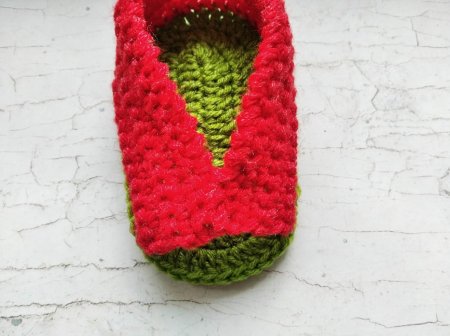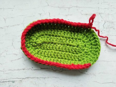 Свяжем еще 1 ряд. В закруглении у нас получилось 12 Ст СН. Нам нужно сделать 6 прибавок. Делаем их через петлю в то место, откуда выходит галочка из 2 Ст СН, провязанных в 1 петельку. А в оставшиеся столбики вяжем по 1 Ст СН. Ряд в конце соединяем. Мы связали подошву.