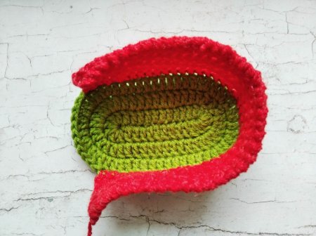 Присоединяем красную нить к следующей петле от маркера и вяжем ряд Ст БН за заднюю стенку петель до следующего маркера.