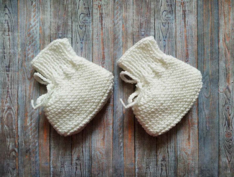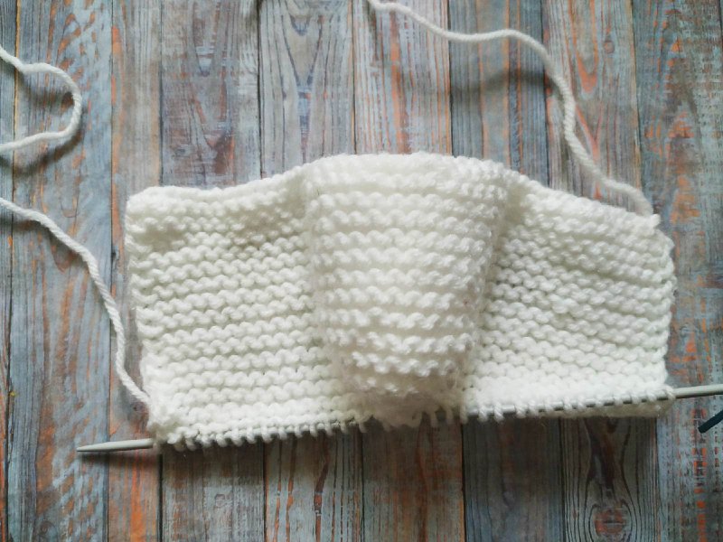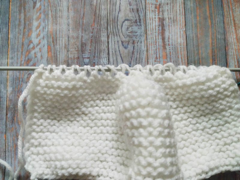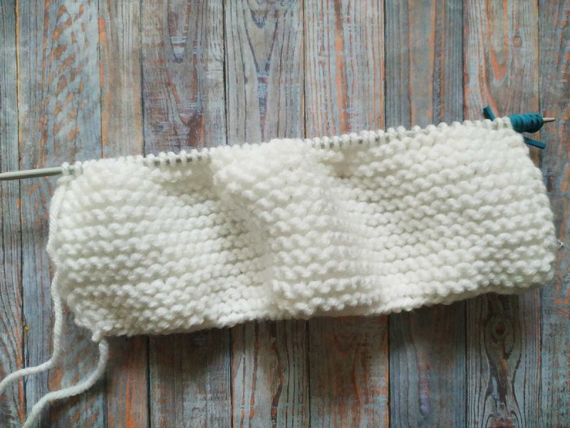Далее просто провязываем платочной вязкой 24 ряда. В каждом ряду первую кромочную снимаем, последнюю петлю, которая будет второй кромочной, провязываем изнаночной петлей. Все остальные петли в каждом ряду провязываем лицевыми.