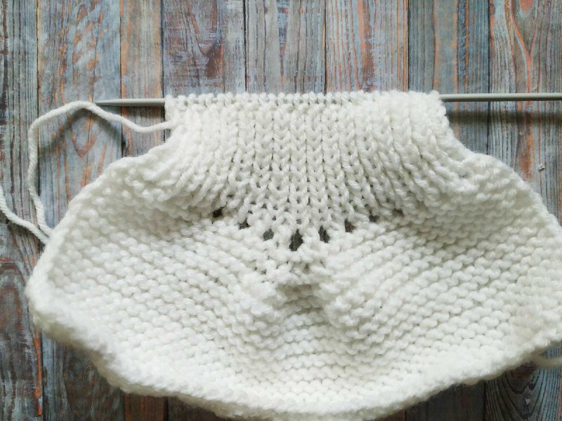 Теперь свяжем ряд, в котором сделаем дырочки для шнурка. Для этого снимаем кромочную, провязываем 2 петли вместе лицевой. Затем делаем накид и снова 2 петли вместе. Далее опять накид и 2 петли вместе. Так до конца ряда.