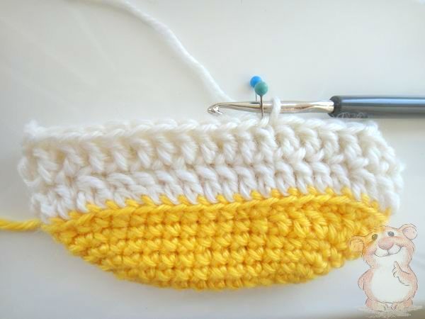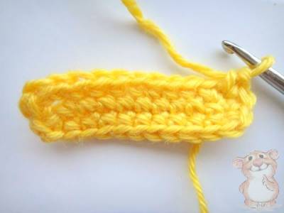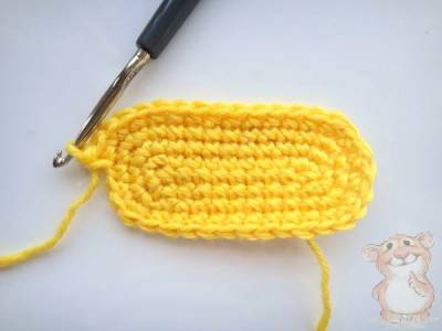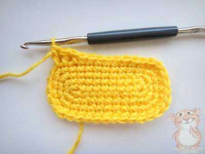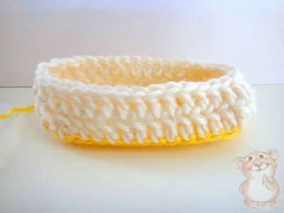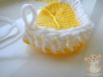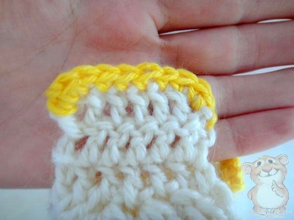 Делаем оторочку желтого цвета: вяжем столбиками без накида 3 и 4 ряд кроссовка, на поворотах вяжем по 2 столбика без накида в одну петлю.
