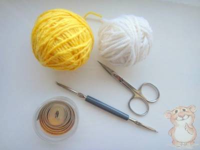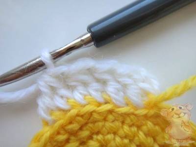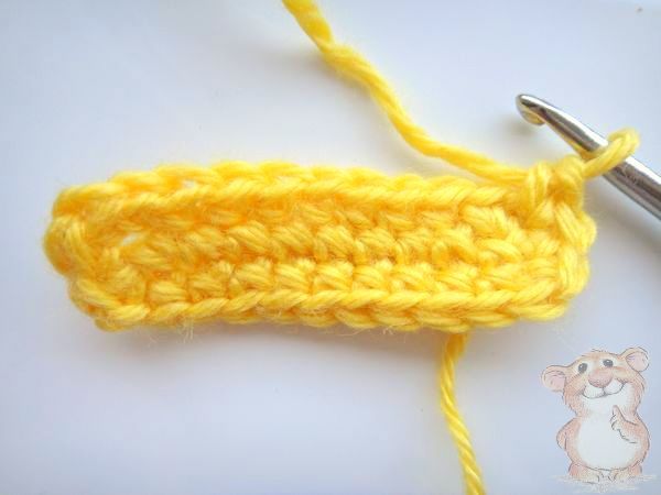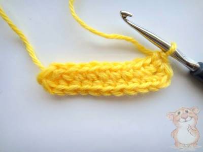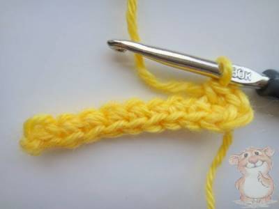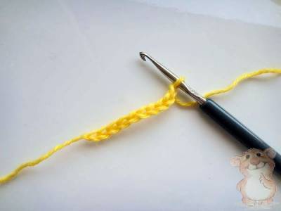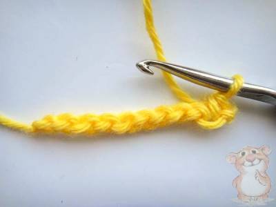 Берем пряжу, выбранную в качестве окантовки (у меня желтого цвета) и делаем цепочку из десяти воздушных петель.Добавляем одну петлю и делаем столбик без накида во вторую от крючка петлю.