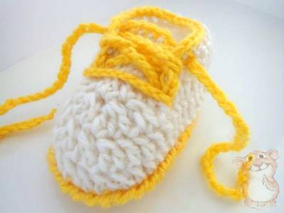 Белой нитью делаем 2 воздушные петли для подьема и провязываем 6 столбиков с накидом, переворачиваем изделие и делаем еще 2 ряда по 6 столбиков с накидом. В конце оторочка желтой нитью из столбиков без накида, на поворотах - по 2 столбика без накида в одну петлю.Шнурки – это плотно связанная цепочка воздушных петель желтого цвета. Сосчитать количество петель довольно трудно, да и незачем, в сантиметрах – это где-то 60 см. Осталось дело за малым – зашнуровать вязаный кроссовок.