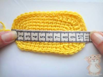 Провязываем ряд до конца обычными столбиками без накида. Последний, шестой ряд вяжем столбиками без накида, не забывая делать плавные «повороты» (по 2 столбика без накида в одну петельку). Заканчиваем полустолбиком, меряем подошву сантиметром.