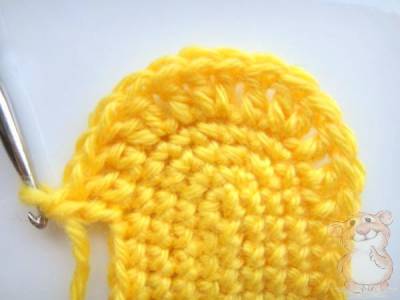 И вяжем столбиками без накида до конца ряда. Замыкаем круг, осуществляя плавный переход, теперь тремя столбиками без накида и выходим на второй круг.