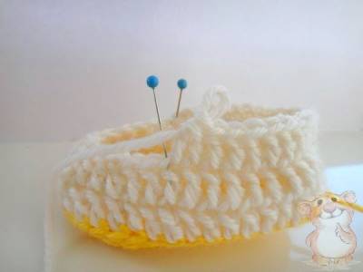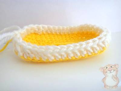 4 ряд: переворачиваем изделие, 2 воздушных петли для подьема, вначале и в конце два столбика с накидом, провязанные вместе, все остальное - столбики с накидом. Дальше нам понадобится желтая пряжа, поэтому сейчас следует провязать подошву рачим шагом, захватывая оставшуюся нижнюю нить.