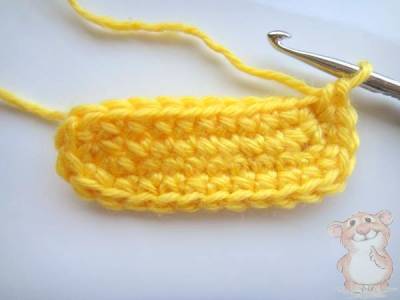 Делаем для подъема одну воздушную петлю и провязываем весь ряд столбиками без накида, на повороте делаем два столбика без накида в одну петлю.
