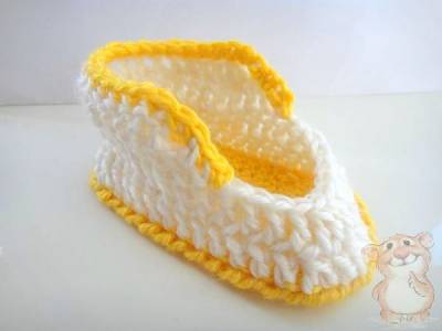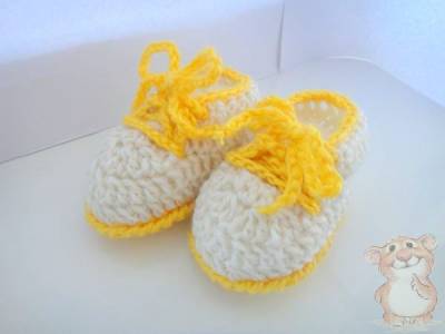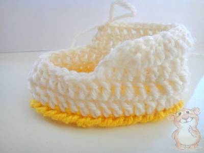 Пинетки в виде маленьких детских кроссовок смотрятся очень стильно и подойдут (в зависимости от выбранного цвета пряжи) как для мальчиков, так и для девочек. Я выбрала универсальный белый цвет с желтой окантовкой. Готовое изделие при желании можно дополнительно украсить бантиками или бисером.Способ вязания кроссовок довольно прост. Условно его можно разделить на три этапа: вязание подошвы пинеток, самого кроссовка, язычка и шнурков. Ниже описаны все эти этапы с фотографиями.