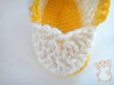 Не обрезая желтой нити, вплетаем вторую нить основы (у меня белая), делаем 2 воздушных петли для подъема, делаем два столбика с накидом, два по 2 столбика с накидом, провязанные вместе. Обращаю ваше внимание, первый ряд основы вяжем только с верхней нитью подошвы.Дальше вяжем 13 столбиков с накидом, два столбика с накидом, провязанные вместе/один/два/один/два.