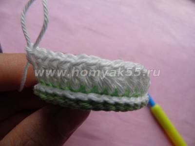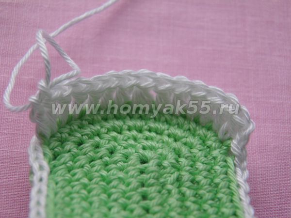 Обратите внимание! В последнюю петлю одной стороны цепочки провязываем 3 столбика без накида и идём дальше, обвязывая вторую сторону. В последнюю петлю полного ряда провязываем 2 столбика без накида (СБН) и сразу переходим на второй ряд. Вязание идёт по кругу без соединительных петель! В первую петлю второго ряда провязываем 2 столбика без накида.