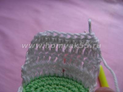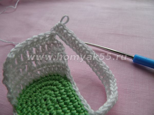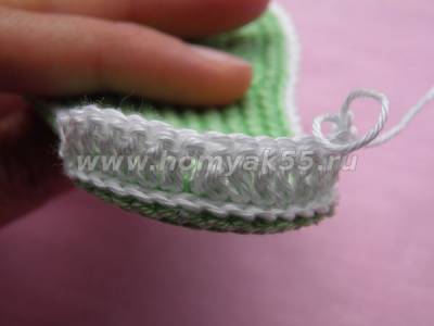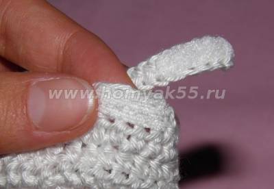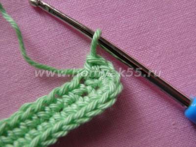 Следующий ряд: обвязать весь ряд СБН, только в 56-ю и в последнюю петлю провязать по 2 СБН. Закончить вязание двумя соединительными петлями.