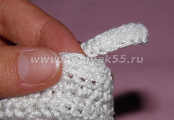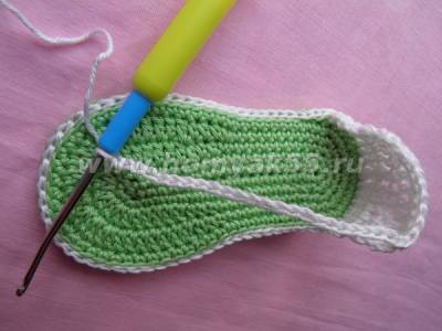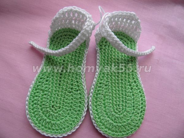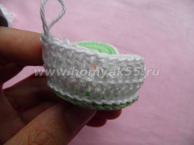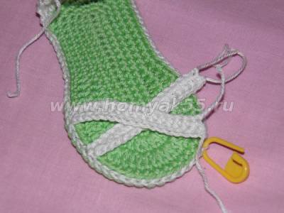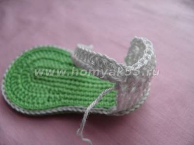 Берём в руки второй сандалик. На нём задник и ремешок вывязываются аналогично, с той только разницей, что прикрепляем нить мы с другой стороны пяточки. В таком случае лицевая сторона первого ряда будет смотреть наружу, а не внутрь, и ремешок будет с другой стороны.