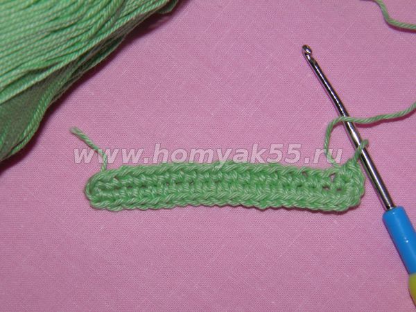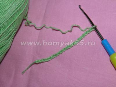Во вторую от крючка петлю провязываем столбик без накида. Повторяем действие со следующими петлями, и таким образом обвязываем нашу цепочку с двух сторон.