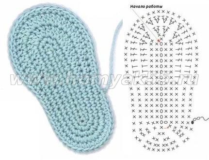 В первую очередь вяжется подошва. Можно использовать следующую схему:В таком случае сандалики получаются совсем маленькие – на ножку новорожденного. Для подошвы наших босоножек схема была немного изменена. Итак, приступим! Вяжем цепочку из 20 воздушных петель.