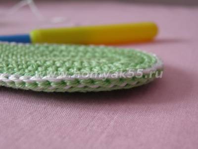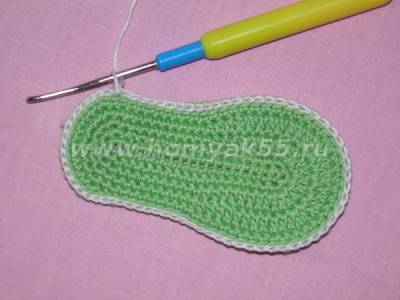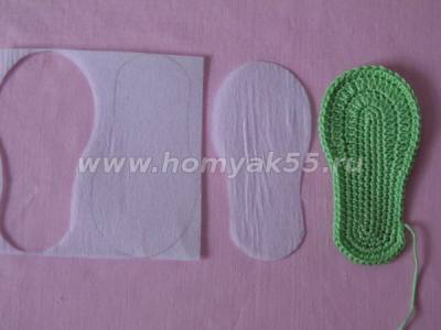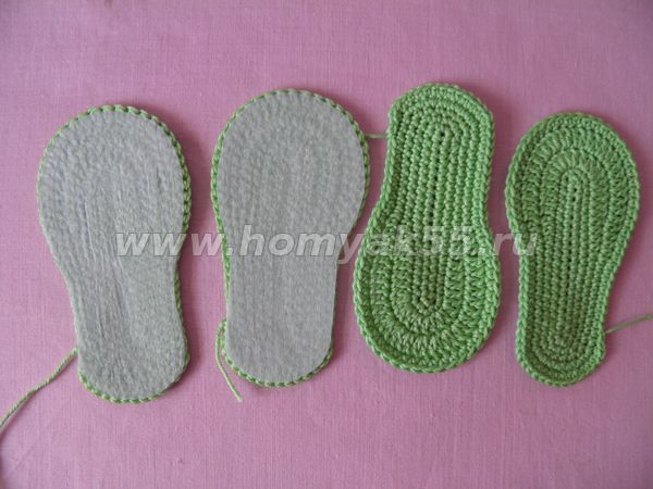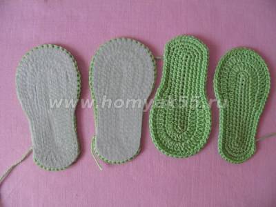 Проклеить нужно только две детали. Они будут нижней частью подошвы. Далее прикладываем верхнюю часть к нижней и обвязываем соединительными столбиками нитью другого цвета. При обвязке захватываем только задние стенки петель.