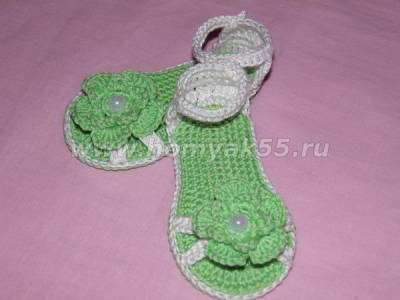 Завершающий этап. Пришиваем или приклеиваем бусину к цветку, прячем торчащие нитки в вязание. Теперь сандалики готовы украсить ножку модницы-малышки!