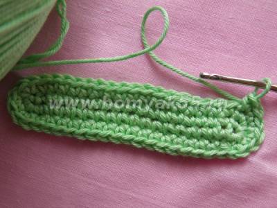 Во вторую от крючка петлю провязываем ПСН, и в следующие 22 петли по 1 ПСН. Поворачиваем получившийся ремешок вниз и закрепляем соединительной петлёй с предыдущим рядом задника.