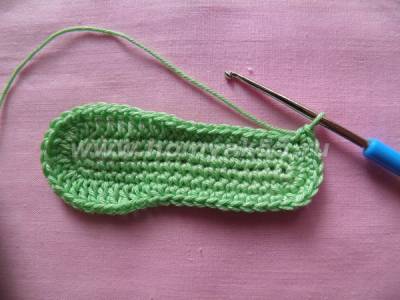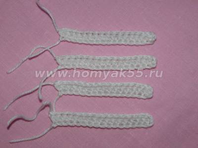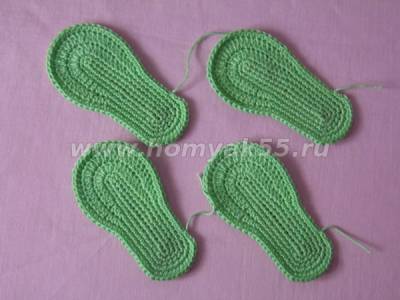 Следующий этап – носовая часть сандалика. Набираем цепочку из 18 воздушных петель. Во вторую от крючка петлю провязываем ПСН. И так до конца ряда, всего 16 ПСН. Таких деталей должно быть 4 шт.