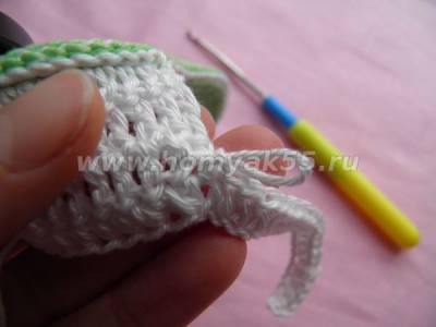 Приступаем к вывязыванию задника. Прикрепляем нить так, чтобы при вязании лицевая часть первого ряда у нас смотрела внутрь.