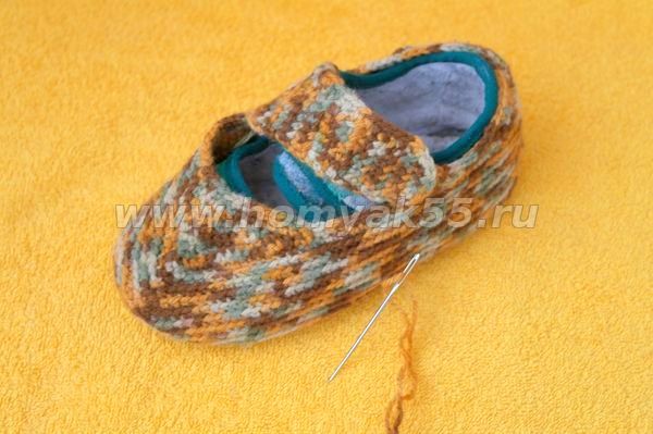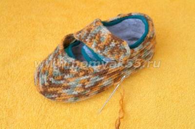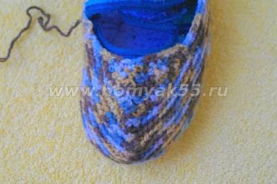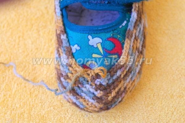Чтобы правильно связать мысик «носика» тапочка, следует прикладывать вязаное полотно к тапочку и смотреть, где нужно добавить петли, а где сократить.
