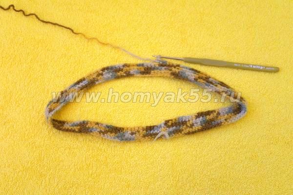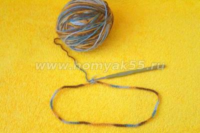 Из воздушных петель связала цепочку. Количество петель должно соответствовать длине «окружности» подошвы тапочек. Первую и последнюю петли цепочки замнула в кольцо.