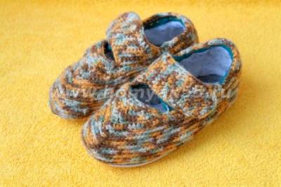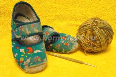 Не знаю, как другие дети, но мой пятилетний сын до сих ползает на коленках, когда играет машинками. При этом ужасно страдает домашняя обувь: «носы» тапочек вытираются в хлам. Вроде и размер еще подходит, и тапочки еще не сношены, но внешний вид уже не тот. Вот и получается, что домашняя обувь у нас покупается «с запасом». Решение проблемы пришло неожиданно, когда я увидела, как вяжут домашние тапочки-угги. В общем, вот что у меня получилось.Для работы я взяла остаток пряжи, окрашенной в несколько цветов, крючок, цыганскую иголки и сами поношенные тапочки.