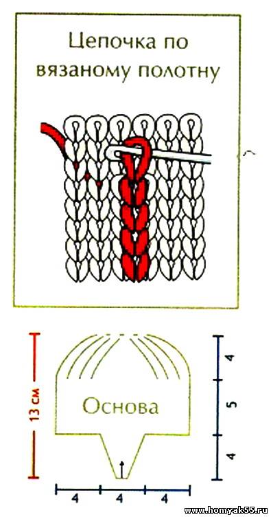Связать 4 детали. Нитью розового цвета набрать 2 петли и вязать плат. вязкой, прибавив в 3-м ряду с обеих сторон по 1 петле. Через 12 рядов связать на протяжении всего ряда по 2 петли вместе лиц. = 2 петли и закрыть петли.