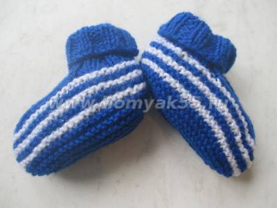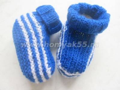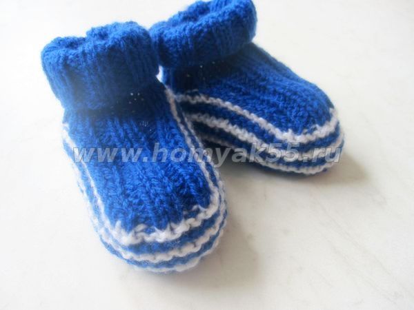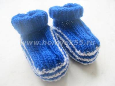 Мягкие, теплые пинетки – незаменимая вещь в гардеробе новорожденного малыша. Пока он не встанет на ноги и не начнет самостоятельно ходить, вязанная обувь лучше всего подойдет для правильного формирования и защиты стопы. Пинетки можно легко связать самостоятельно. Их можно сделать сразу несколько штук разных цветов и подбирать в тон остальному комплекту одежды.Для того чтобы связать пинетки на 3-5 месячного малыша, потребуется 30 г синей и немного белой пряжи YarnArt Baby (150 м/ 50 г, 100% детский акрил) и спицы № 3,5.
