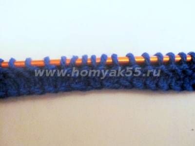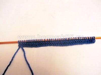 Набрать синей пряжей 40 петелек. Сделать два ряда платочной вязкой. Это считается одной грядкой.