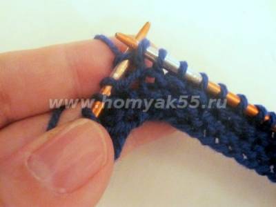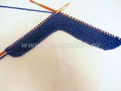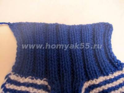 Затем работу вновь развернуть и далее вязать резинкой 2 х 2 центральные 10 петель, провязывая в каждом ряду последнюю, 10-ую петлю вместе с одной петлей боковины. Продолжить до тех пор, пока от боковин не останется по 13 петелек. Закончить мысок лицевым рядом.