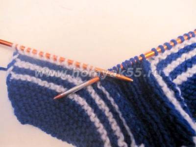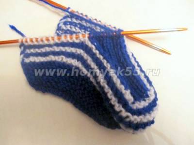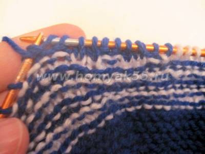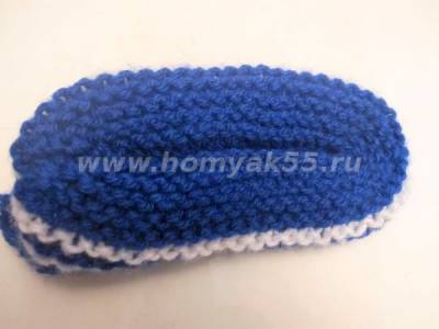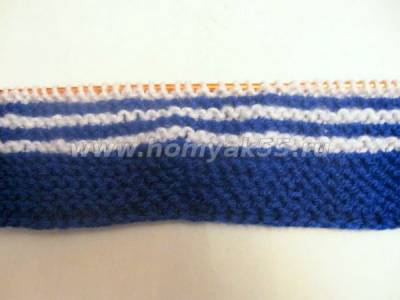 После этого следует приступить к вязанию декоративной боковины пинеток. С правого края полотна нужно присоединить белую пряжу и выполнить ею 1 платочную грядку. Далее необходимо чередовать синюю и белую пряжу, чтобы получились 3 белые полоски.