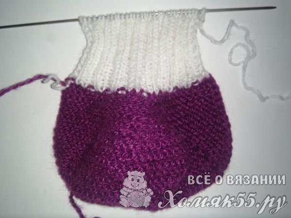 Вяжем один ряд лицевыми петелечками. А далее начнем вязать резинку. Она будет белого цвета. Вяжем две лицевые петли, две изнаночные, две лицевые, две изнаночные и так до конца ряда.