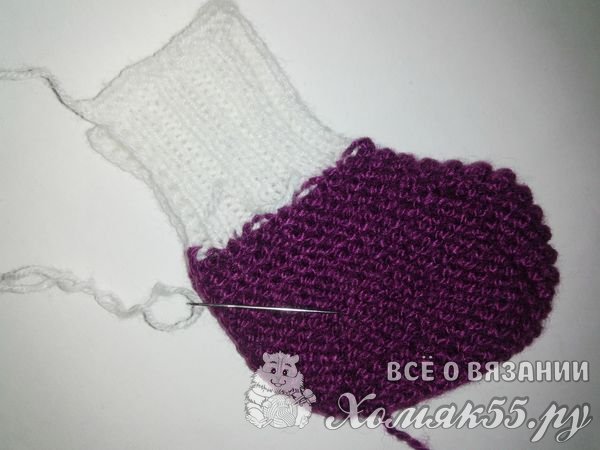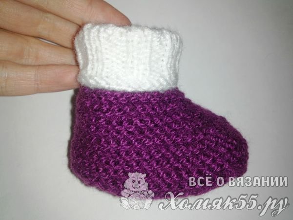 Расправляем вязание. И при помощи иголки сшиваем сзади по изнаночной стороне наши пинетки.