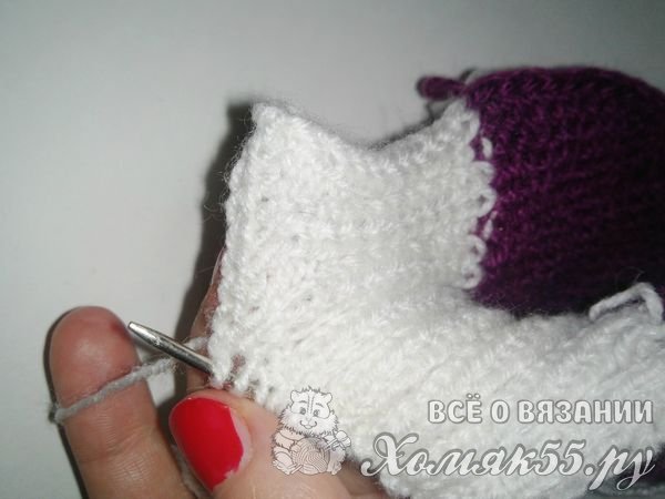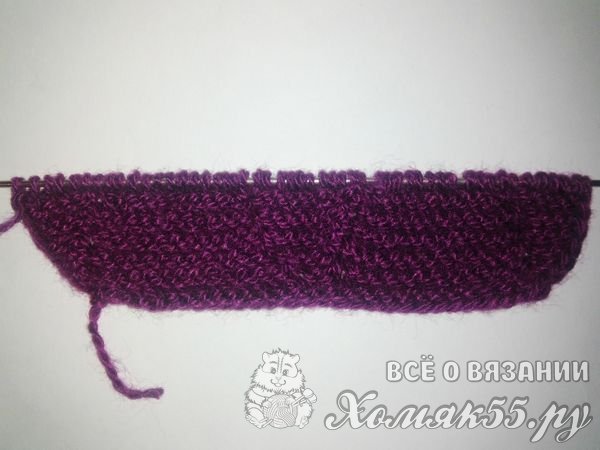 Снова вяжем пятнадцать петель, две петли вместе, одну лицевую и еще раз две вместе. До конца ряд выполняем лицевыми петелечками. У нас получился вот такой мысок.