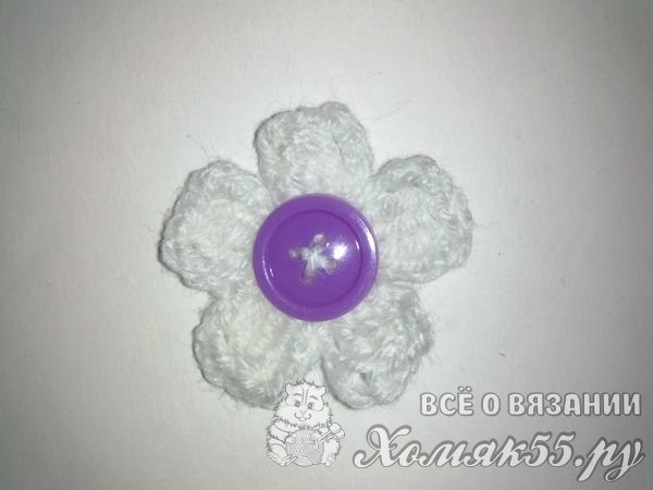 Для этого сделаем шесть воздушных петель и замкнем их в кольцо. Сделаем четыре воздушные петли и провяжем в начальную петельку три незаконченных столбика с двумя накидами. Провяжем их вместе. Снова сделаем четыре воздушных петли и провяжем в ту же точку столбик без накида. Сделаем еще четыре таких лепестка. А в серединку пришьем пуговицу в тон пинеткам. И пришьем цветочек к пинеткам.