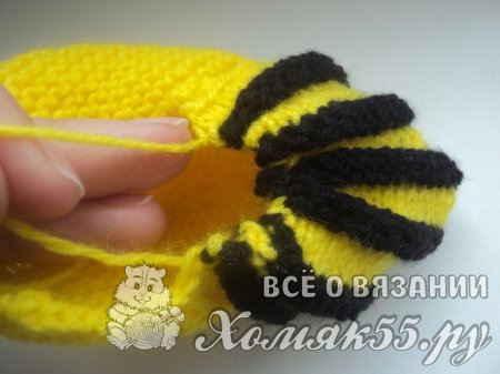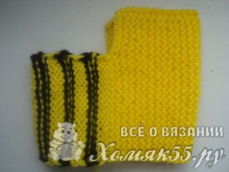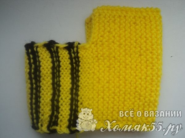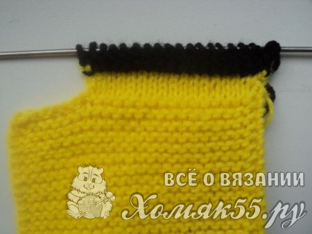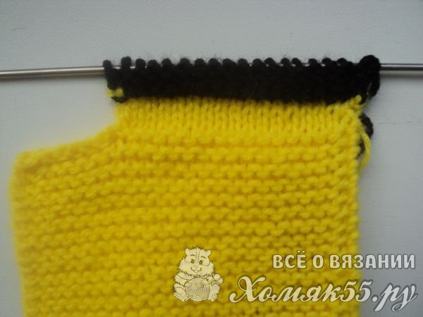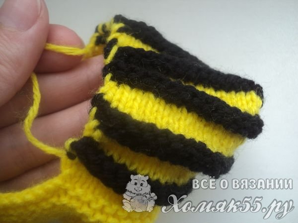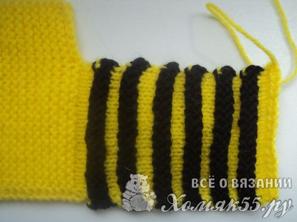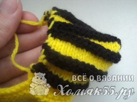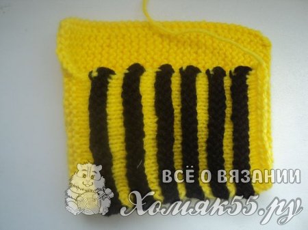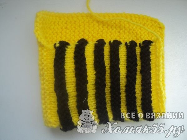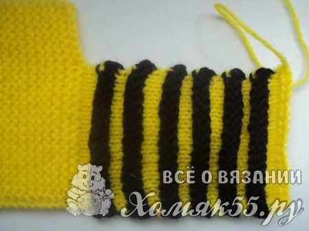 Опять вяжем дальше желтой пряжей. Так мы будем вязать шесть черных полосок и семь желтых.