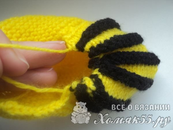 Теперь выворачиваем пинеток. И берем нитку желтого цвета. Пропускаем ее через верхнюю часть пинеток по краю. То есть как будто нажиуливаем.