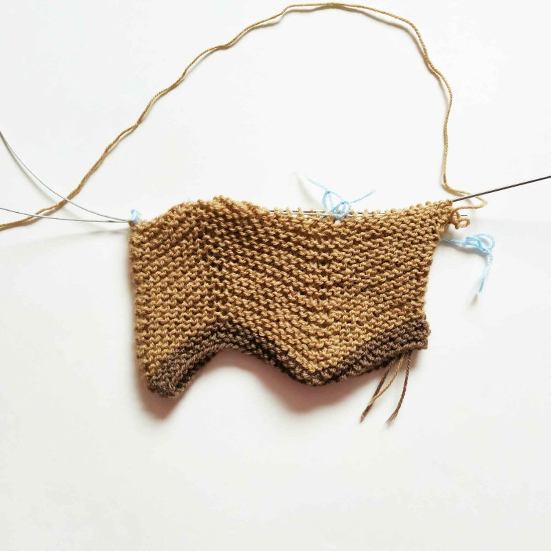 Вяжем лицевыми петлями до последней метки и делаем возле нее накид.