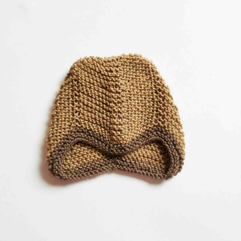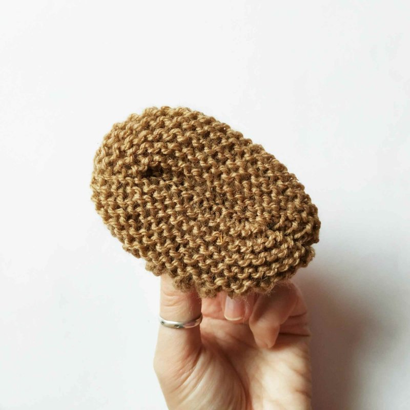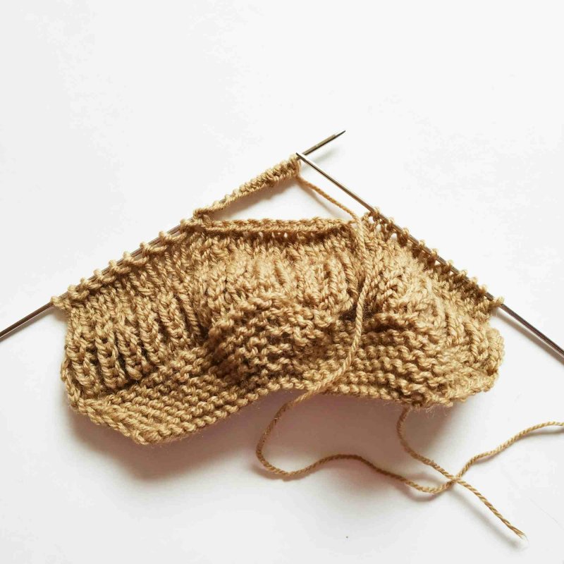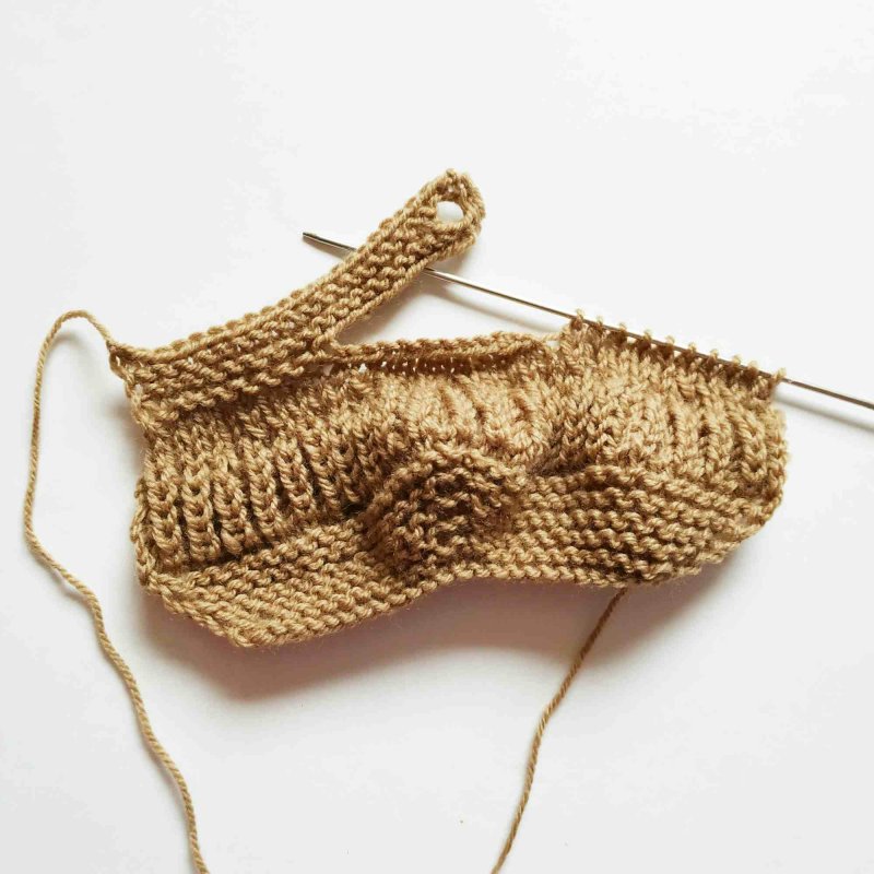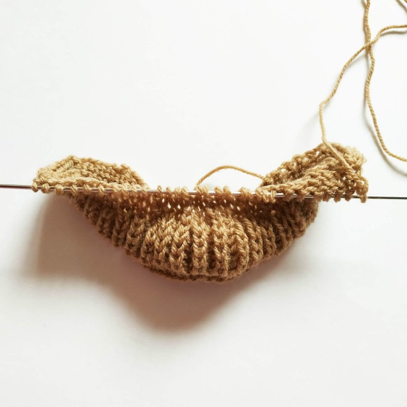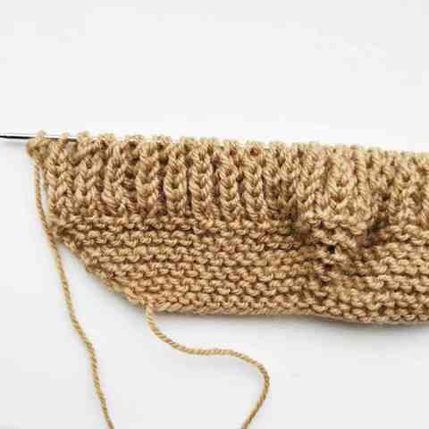 Коричневой пряжей провяжем 4 ряда платочной вязкой по кругу. То есть чередуем лицевой ряд и изнаночный.