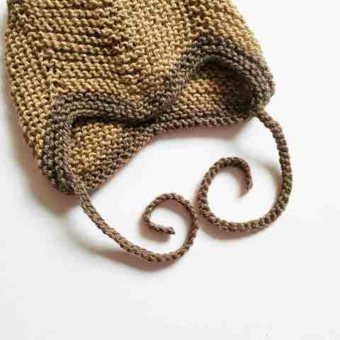 Присоединим коричневую пряжу к ушкам и свяжем веревочки для шапки. Наберем 70-80 петель. И провяжем 1 ряд полустолбиками крючком.