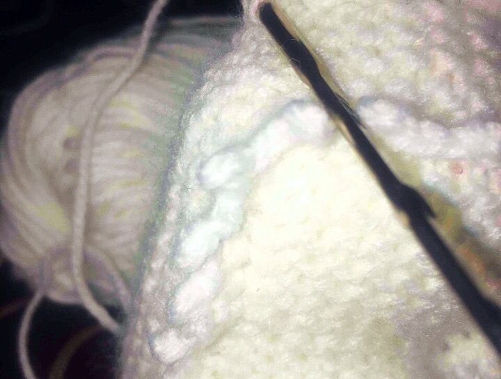 Аккуратно сшиваю пинетку. Беру крючок и делаю обвязку верха, отворота, мыска и подошвы пинеток. Схема: Столбик без накида, пико(для пико вяжу цепочку из 3 воздушных петель и закрепляю ее в от месте, где она начиналась, соединительным столбиком), столбик без накида- так до конца ряда.