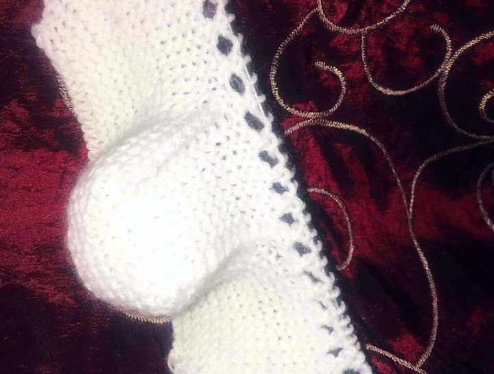 Провязываю 14 рядов, все ряды лицевые петли.Далее: Делю вязание на три части -10 петель середина и по 23 петли по бокам. Продолжаю вязание: 1 кромочная, 21 лиц., 2 пели вместе лицевой, 8 лиц., 2 петли вместе лиц.; Переворачиваю вязание на изнаночную сторону. Далее вяжу только середину пинетки: 1 кром., 8 лиц, 2 петли вместе изнаночной. Опять переворачиваем на лицевую сторону. Вяжем так пока по бокам останется по 13 петель. На спице осталось 36 петель. Далее провязываю 2 ряда лицевыми петлями.. Далее: 1 кромочная, (две вместе лицевой, 1 накид), так до конца ряда , 1 кромочная. Следующий ряд: все петли лицевые. Таким образом связался мысок пинеток и получились дырочки для завязок.