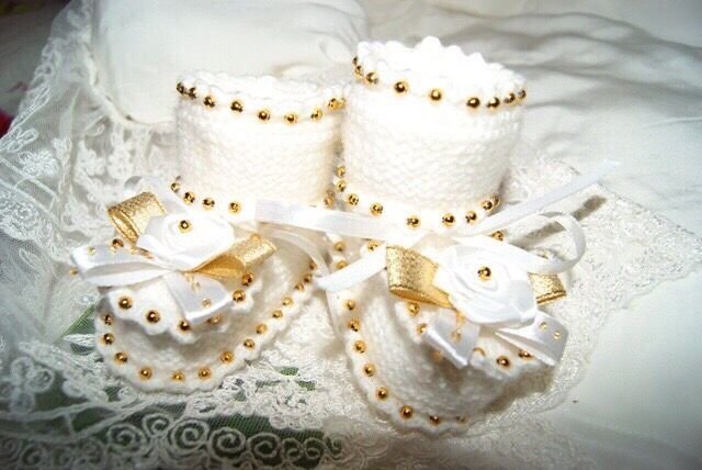 Далее декор пинетки. Я пришиваю на каждый зубчик обвязки золотую бусинку. Здесь лучше пользоваться леской.Не будет видно следов пришивания.Выглядит очень аккуратно.Делаю бантики из белой и золотой ленточки. Пришиваю всё.Сверху на бантик пришиваю атласную розочку(можно приклеить). Продергиваю атласную ленточку -завязку.Декор на этом моменте-это полёт вашей фантазии. Я украшала такие же пинетки в сине-золотом цвете на выписку мальчика из роддома.Получилось так же очень очаровательно.